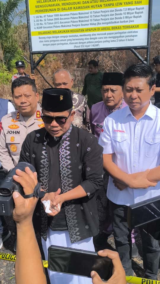 Pelalawan|Mediatorpost.com-Bupati Pelalawan H. Zukri bersama jajaran Forkopimda Kabupaten Pelalawan melaksanakan pemasangan Plang Larangan membakar Hutan dan Lahan (Karhutla) yang berlokasi di kawasan hutan seberang Masjid Ulul Azmi, Pangkalan Kerinci, Jumat (3/10/2025).