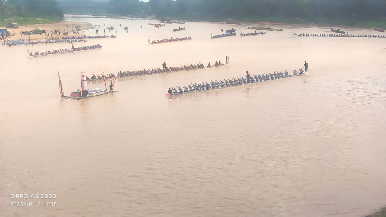 TELUK KUANTAN|Mediatorpost.com – Pacu jalur HUT Kabupaten Kuansing hari pertama, Jumat (10/10/2025) dilepas Bupati Kuansing Dr H Suhardiman Amby MM dari tribun pancang start. Ada 75 jalur yang berpacu di hari pertama. Dengan tanda dentuman meriam cagak yang berbunyi menggelegar di arena perpacuan Tepian Narosa dan bendera mereka dari tangan sang bupati.