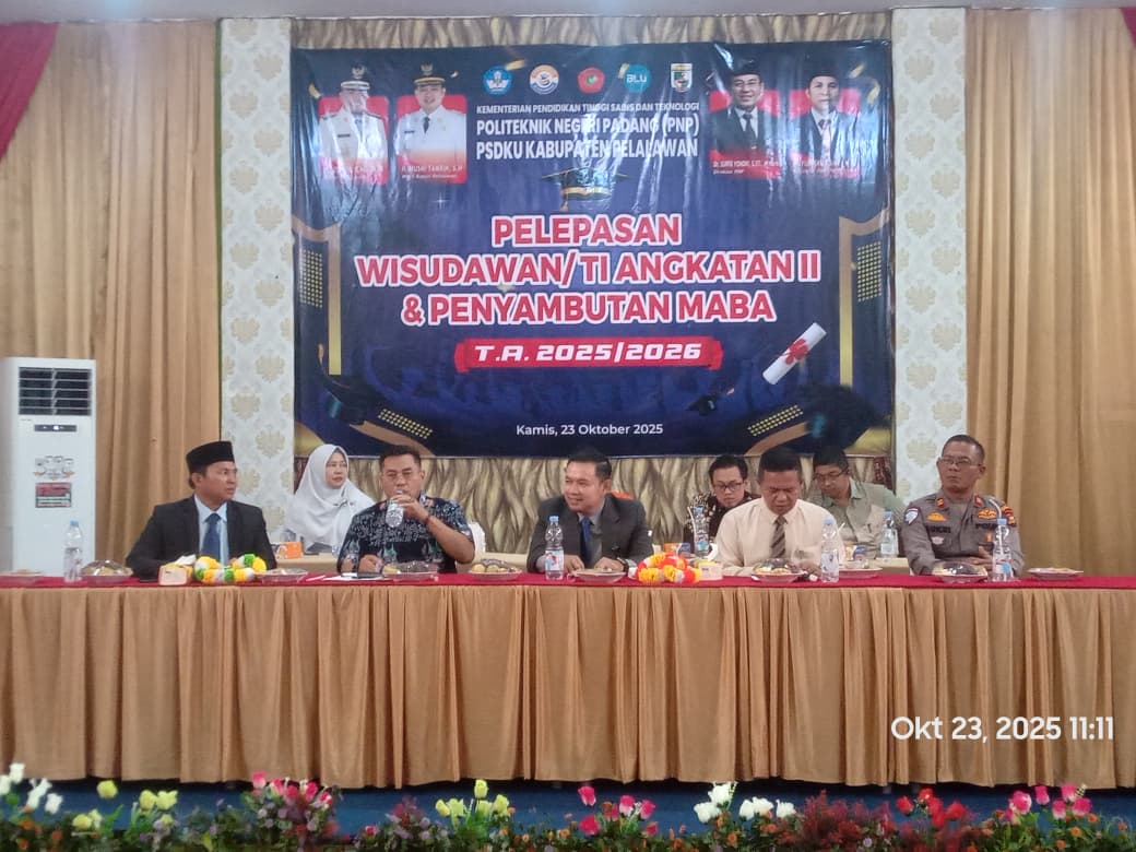 PELALAWAN|Mediatorpost.com – Politeknik Negeri Padang (PNP) Kampus Pelalawan kembali lakukan Wisuda/ti dan penerimaan mahasiswa Baru tahun angkatan 2025. Kegiatan wisuda ini dilaksanakan di aula PNP Kabupaten Pelalawan Pangkalan Kerinci (Kamis, 23 Oktober 2025). Wakil Bupati Pelalawan H. Husni Tamrin SH yang didampingi sejumlah Organisasi Perangkat Daerah (OPD) yakni Kepala Dinas Kominfo dan informatika H. Faisal S.STP, Kepala Dinas Arsip dan Perpustakaan H. Fakhrurozi, Kepala Dinas Pemadam Kebakaran H. Indra Putra serta Kepala Dinas Pendidikan dan Kebudayaan Kabupaten Pelalawan Leo Nardo M.Pd Tampak Mengikuti Kegiatan Wisuda dari awal hingga berakhir kegiatan.