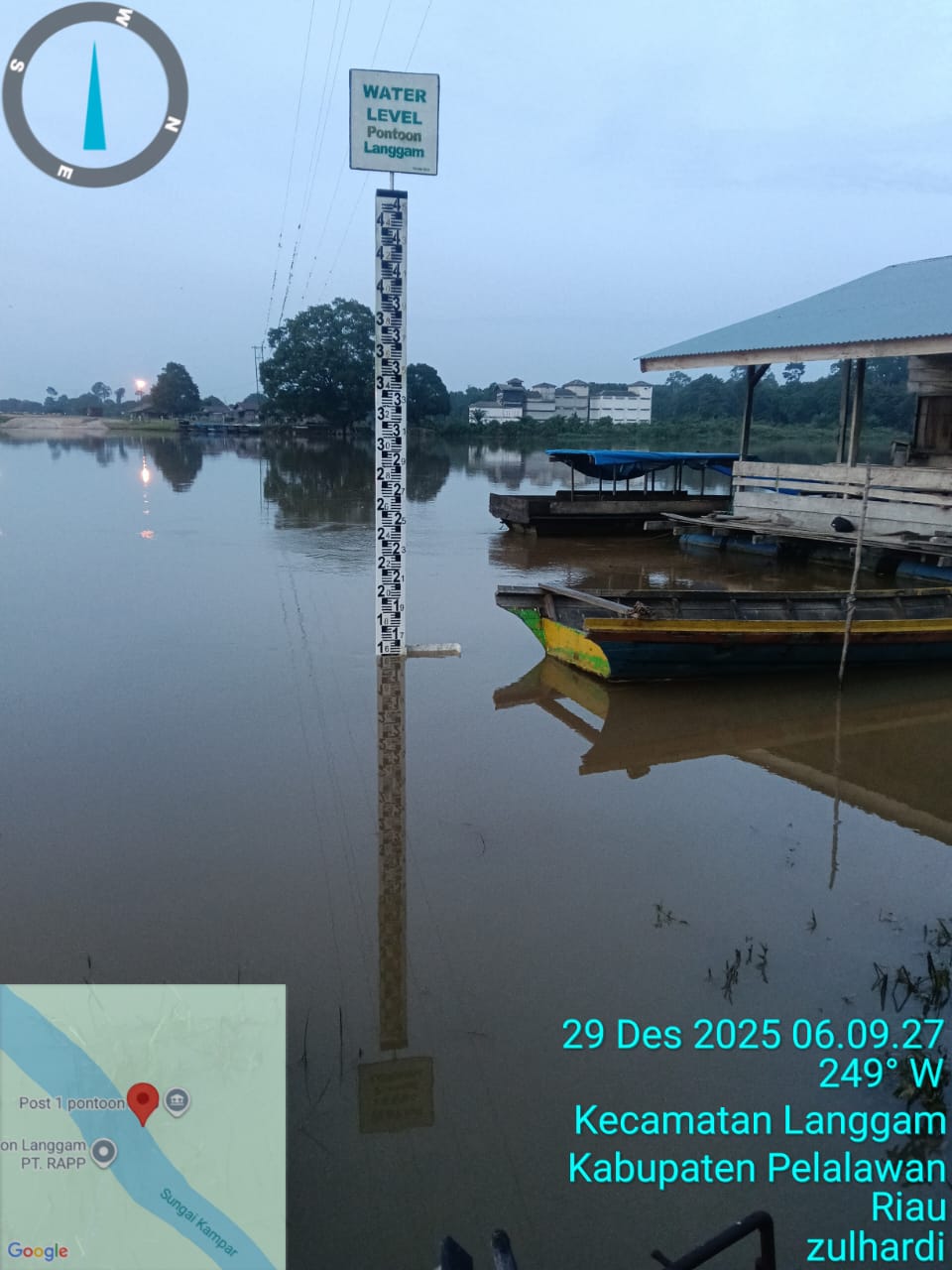 PELALAWAN|Mediatorpost.com— Badan Penanggulangan Bencana Daerah (BPBD) Kabupaten Pelalawan menyampaikan pembaruan kondisi Indicator Level Air Ferry Langgam.Senin,( 29/12/2025).Level air Sungai Kampar di ponton Langgam berada di angka +1,59 meter dengan status rendah.Tercatat terjadi penurunan elevasi air sebesar 13 sentimeter dibandingkan pagi hari sebelumnya.Saat ini, kondisi perairan berada dalam periode pasang surut laut.