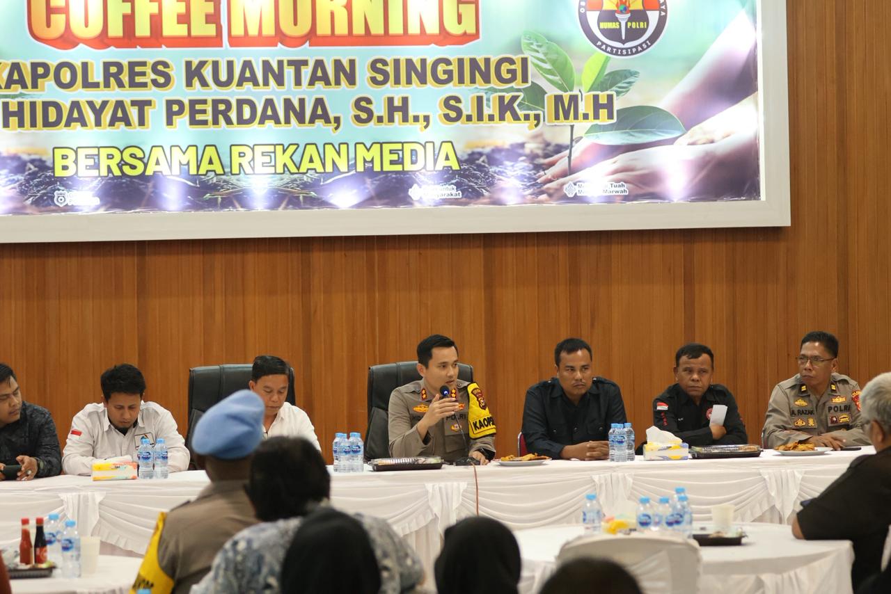 Sementara itu, dalam sambutannya, Kapolres Kuansing AKBP Hidayat Perdana, S.H., S.I.K., M.H., menyampaikan rasa syukur dan apresiasi atas kehadiran seluruh rekan media. Menurutnya, kegiatan Coffee Morning ini merupakan momentum yang sangat baik untuk mempererat silaturahmi serta membangun komunikasi yang lebih konstruktif antara Polres Kuansing dan insan pers.