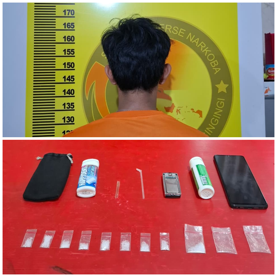 Dari hasil penggeledahan, ditemukan satu paket sabu di kantong celana depan sebelah kanan, satu paket sabu dibungkus kain hitam, serta tujuh paket sabu yang disimpan di dalam botol merek HAPPYDENT di kantong celana belakang sebelah kiri. Total barang bukti yang diamankan sebanyak sembilan paket diduga narkotika jenis sabu dengan berat kotor 3,09 gram.