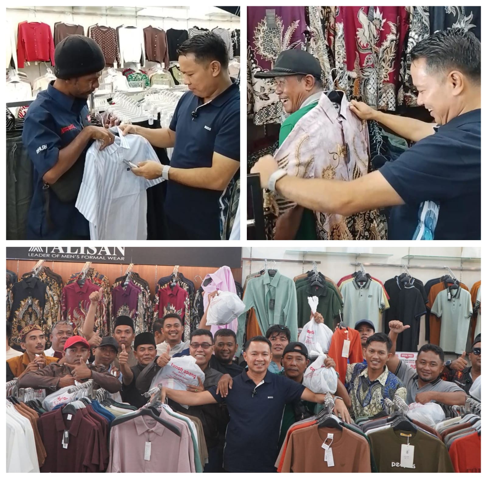 Di antara deretan toko pakaian, para wartawan terlihat antusias memilih berbagai kebutuhan, mulai dari baju, celana, hingga perlengkapan ibadah seperti sarung dan peci. Senyum dan tawa menghiasi suasana, menciptakan momen kebersamaan yang sederhana namun penuh makna.