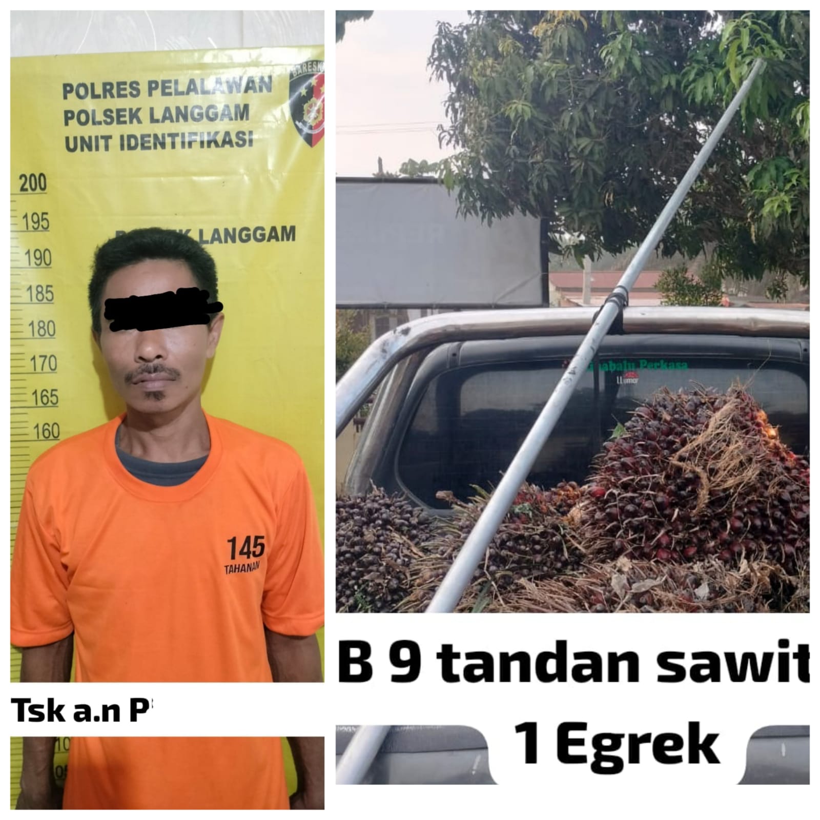 Kapolres Pelalawan AKBP JOHN LOUIS LETEDARA, S.I.K melalui Kapolsek Langgam IPTU Jerry P. Sinaga, S.H menyatakan ” bahwa pelaku ditangkap setelah security CV. Segati Jaya, Jitro Aldikson Hanek dan Abdul Rojak, melihat pelaku sedang memanen buah sawit di Blok A6 A7 Divisi 2. “Kami menerima laporan dari security CV. Segati Jaya dan langsung melakukan pengamanan dan penyelidikan,” ujar Kapolsek.